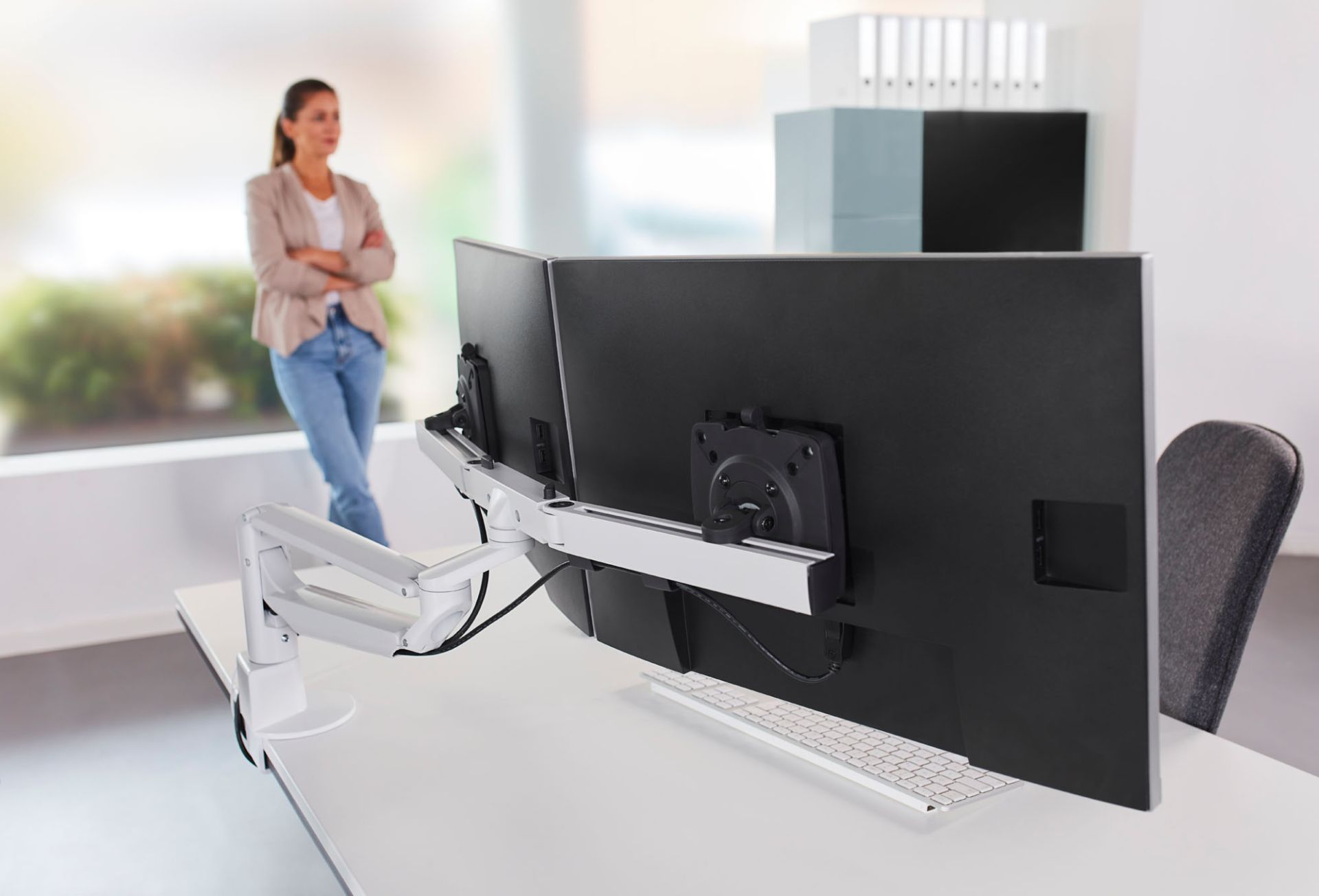 Eine Monitorhalterung schafft wertvollen Platz auf dem Schreibtisch, indem sie Ihren Monitor auf Augenhöhe anhebt. Dies fördert eine bessere Körperhaltung und reduziert die Belastung des Nackens, wodurch eine angenehme und organisierte Arbeitsumgebung entsteht. Viele Halterungen ermöglichen auch eine flexible Positionierung, was die Ergonomie verbessern kann.