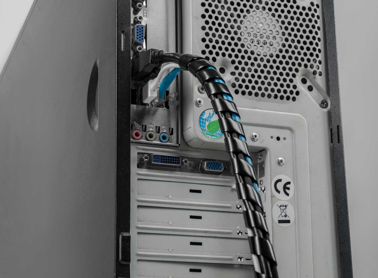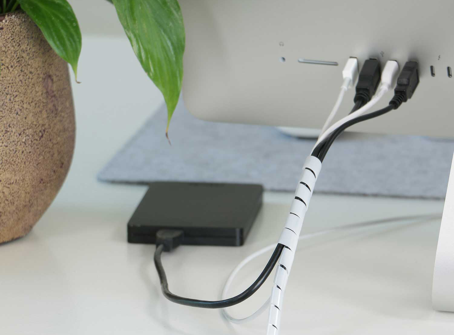 - Durch Kabelspiralen lassen sich mehrere Kabel sicher bündeln und gemeinsam organisieren